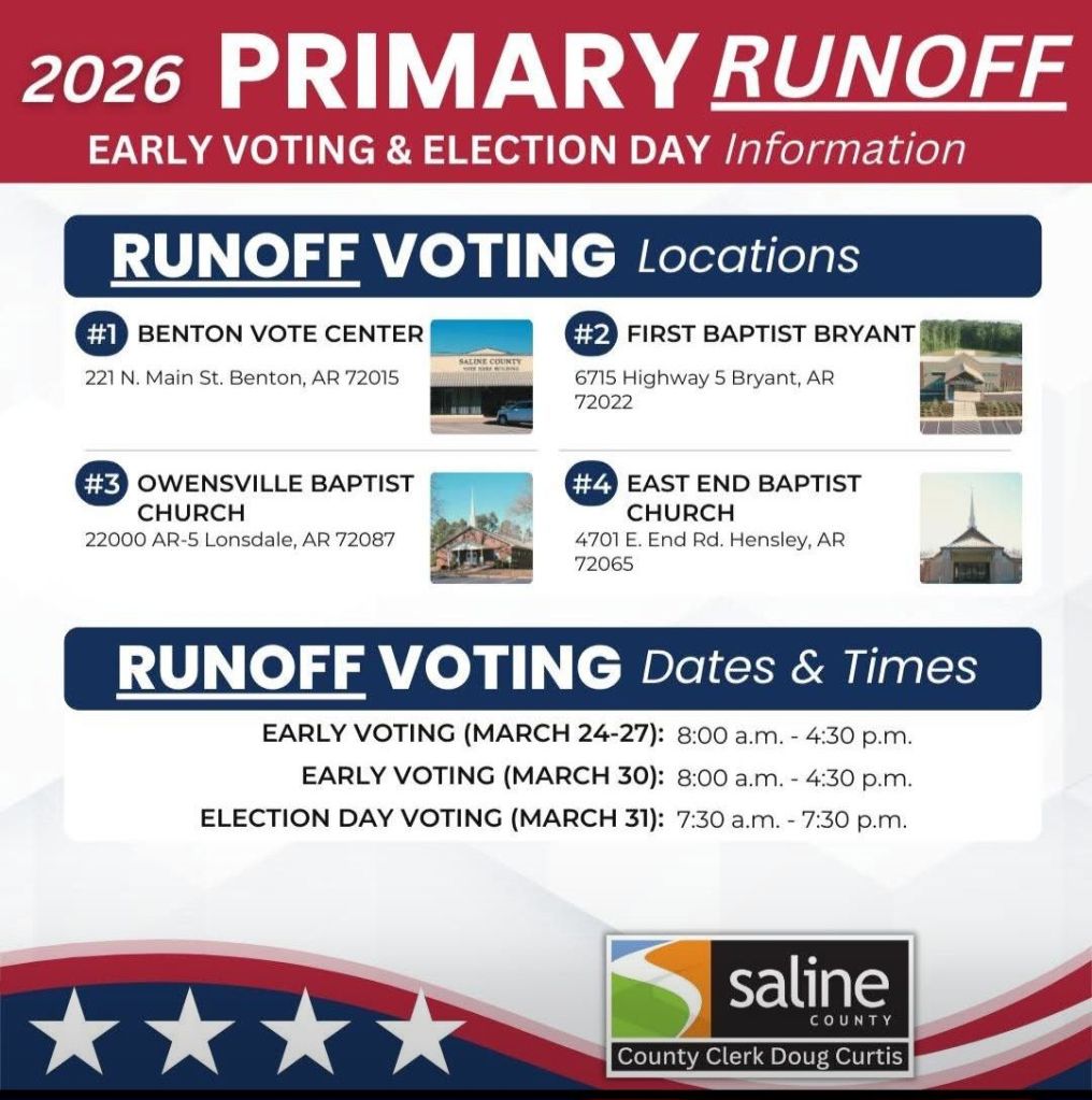 Please join us on March 19, 10:00 a.m., at the Coronado Center for our monthly meeting. This month’s meeting will provide important information regarding the March 31 run-off election for Arkansas Secretary of State and Saline County Sheriff. Candidates in the run-off election will be the featured speakers.