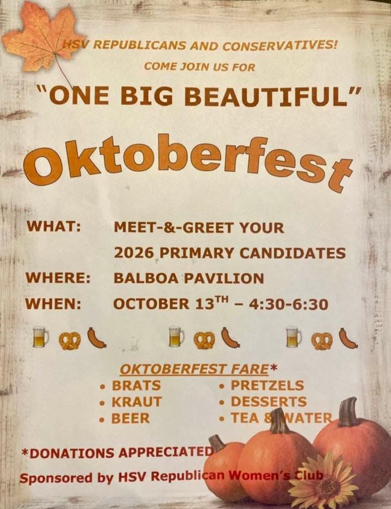 Fun, food, and nationally-known surprise speakers were all part of the recent HSV Republican Women’s America First Rally held at Balboa Pavilion. A near-capacity crowd were treated to catfish with all the trimmings, homemade desserts, and a special visit by “Donald and Melania Trump” who shared their vision for the future of America.